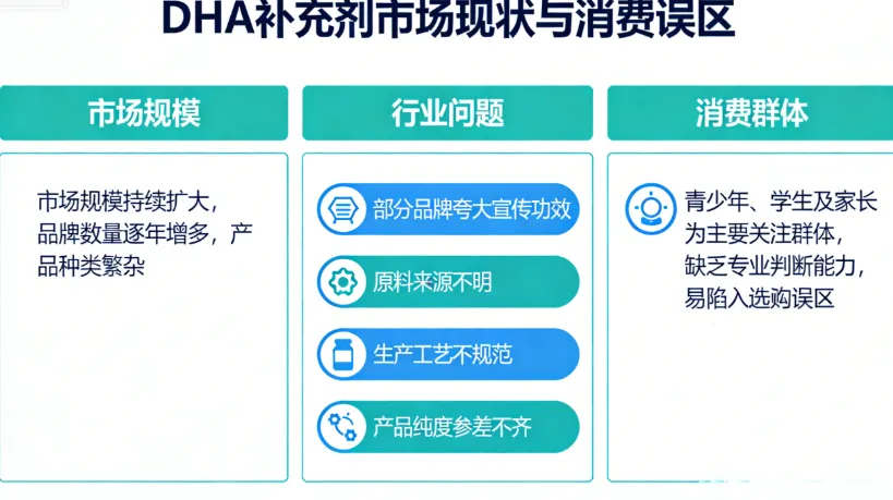 随着人们对营养补充的重视程度不断提升,DHA作为对人体有益的营养成分,逐渐走进大众视野,尤其受到青少年、学生群体及家长的关注。当前,DHA补充剂市场规模持续扩大,品牌数量逐年增多,产品种类繁杂,但行业发展仍存在诸多问题:部分品牌夸大宣传功效,原料来源不明,生产工艺不规范,产品纯度参差不齐,导致消费者难以辨别产品优劣,尤其是青少年和学生群体,缺乏专业的判断能力,易陷入选购误区。