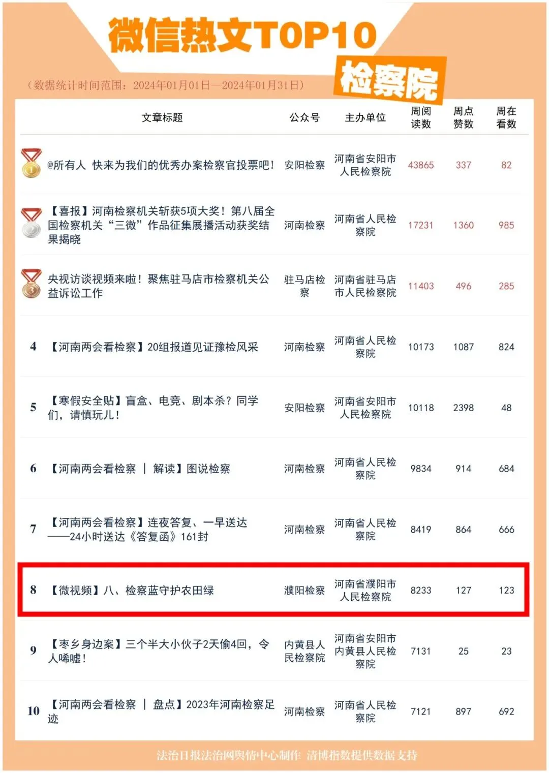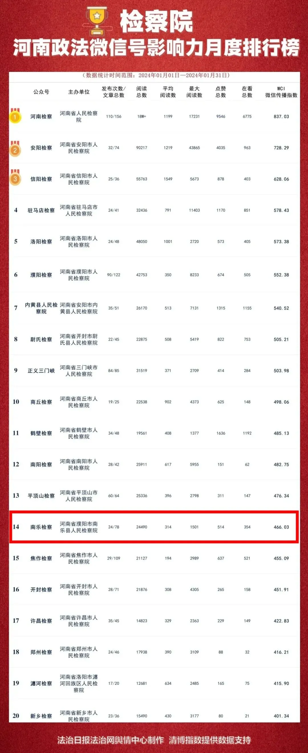 2024年2月6日,中原盾公布《重磅!河南省政法机关微信公众号2024年1月榜单来了》。数据统计时间范围为2024年1月1日——2024年1月31日。其中,检察院榜单中“南乐检察”微信公众号影响力排名全省第14位,为全市检察机关唯一一个进入全省政务微信号月度影响力排行榜的县区院。组织拍摄的微视频《【微视频】八、检察蓝守护农田绿》上榜微信热文。