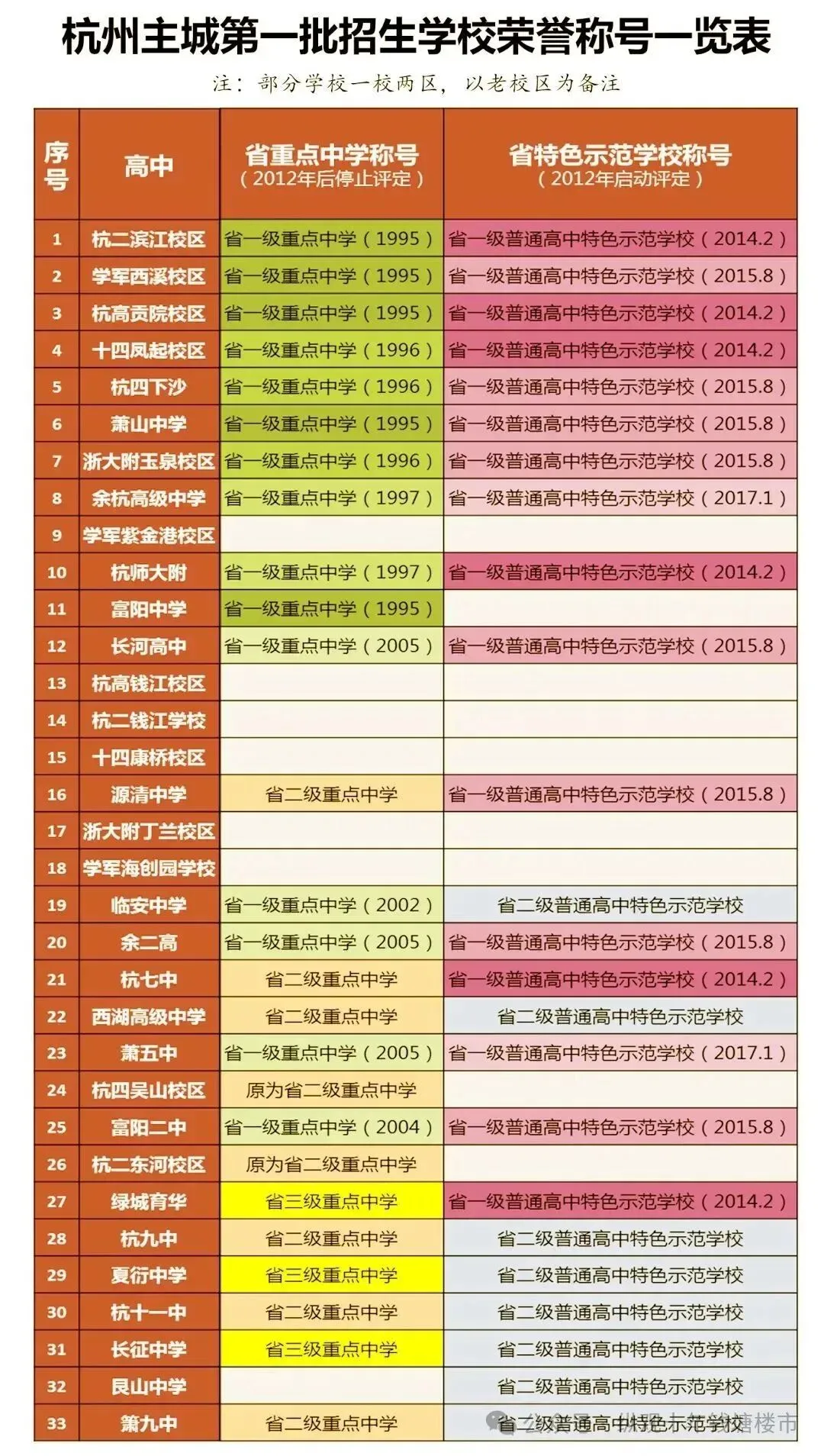 注:杭州绿城育华学校、杭州西子实验学校、杭州二中教育集团天元蕙兰学校、杭州上外附属外国语高级中学、杭州东方中学为民办学校,相关特色班收费标准见学校招生简章。特色班是一些高中把在某一方面有专长的学生组织起来,单独成班。主要招收的特长类别有音乐类、美术类、传媒类。