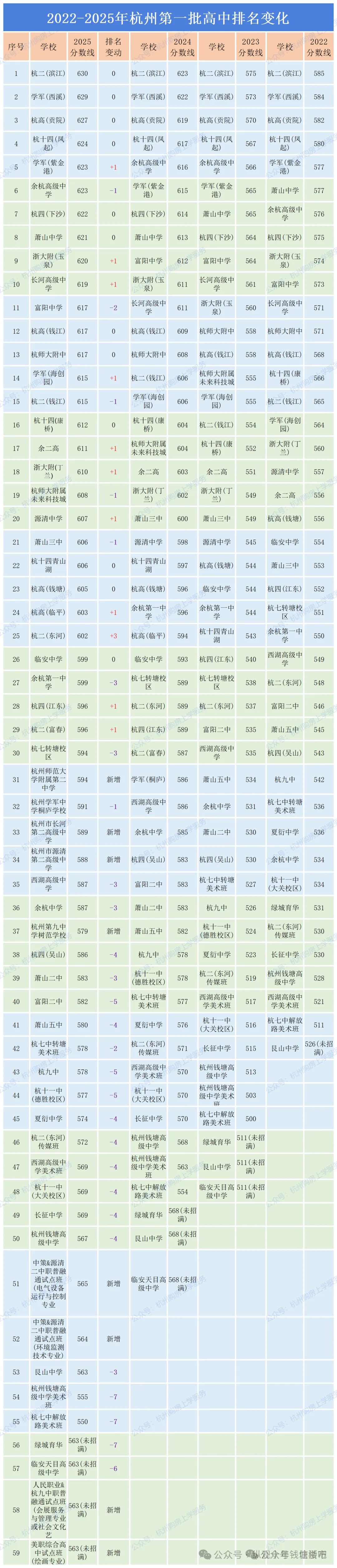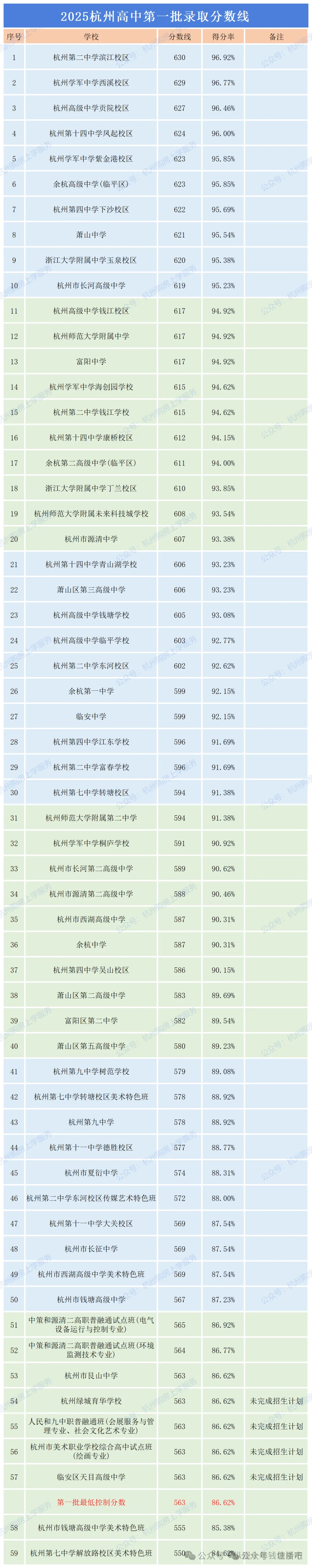 2025年第一批次招生最低录取分数线控制为563分,省重点普通高中、省普通高中特色示范学校及其领办分校(含面向市区等额招生的萧山、余杭、临平、富阳、临安五区普通高中)的招生为第一批招生,其他各类学校(含普通高中、职业高中、技工学校,下同)的招生为第二批招生。