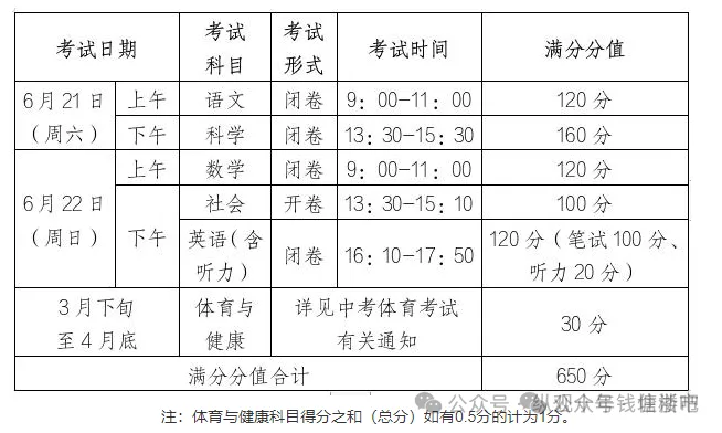 杭州市区中考满分均为650分,含语文120分,数学120分,英语120分,科学160分,社会100分,体育30分。