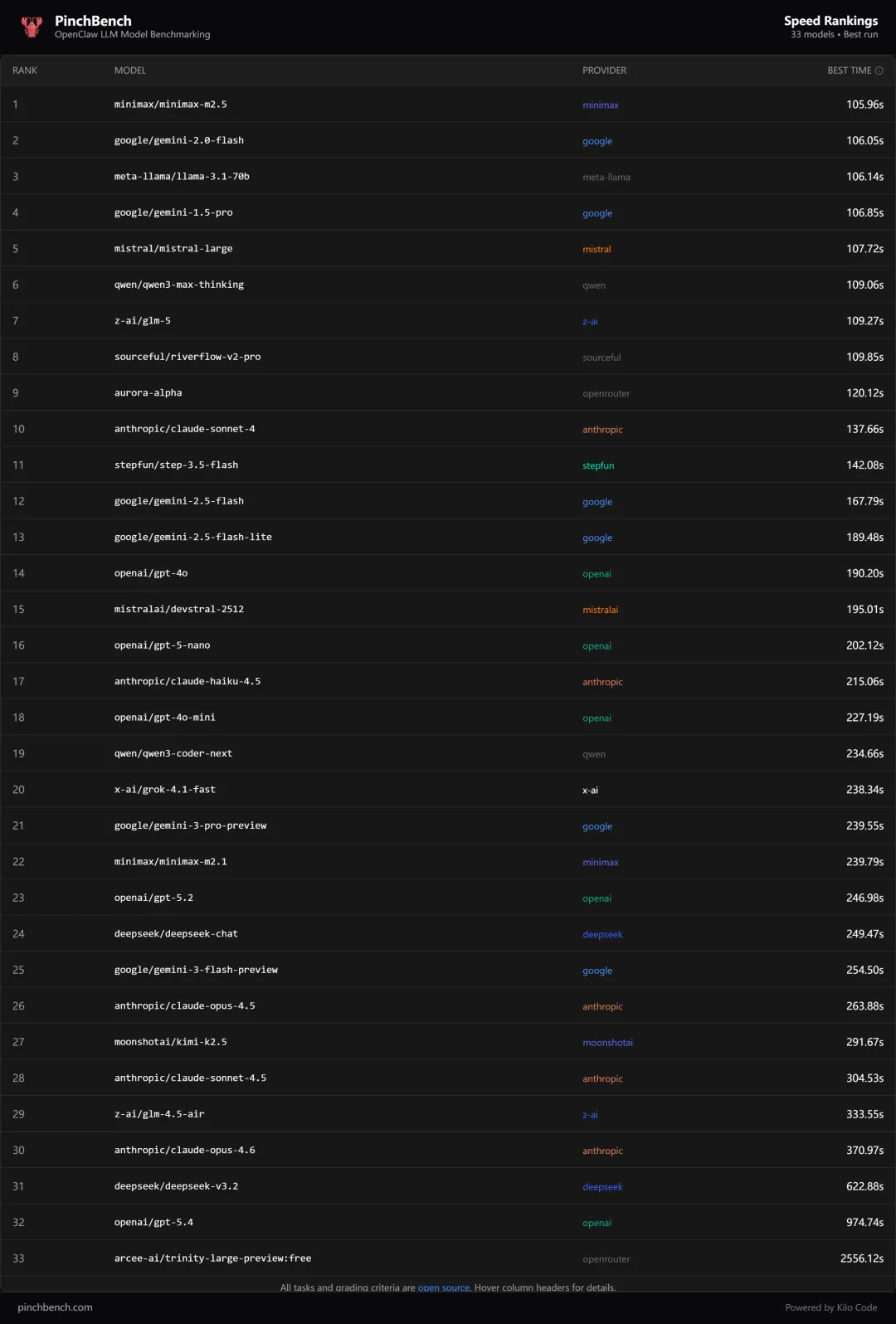 从干活的速度来看,Minimax赢了。虽然只比第二名 Gemini 2.0 Flash 只快了 0.09 秒。
