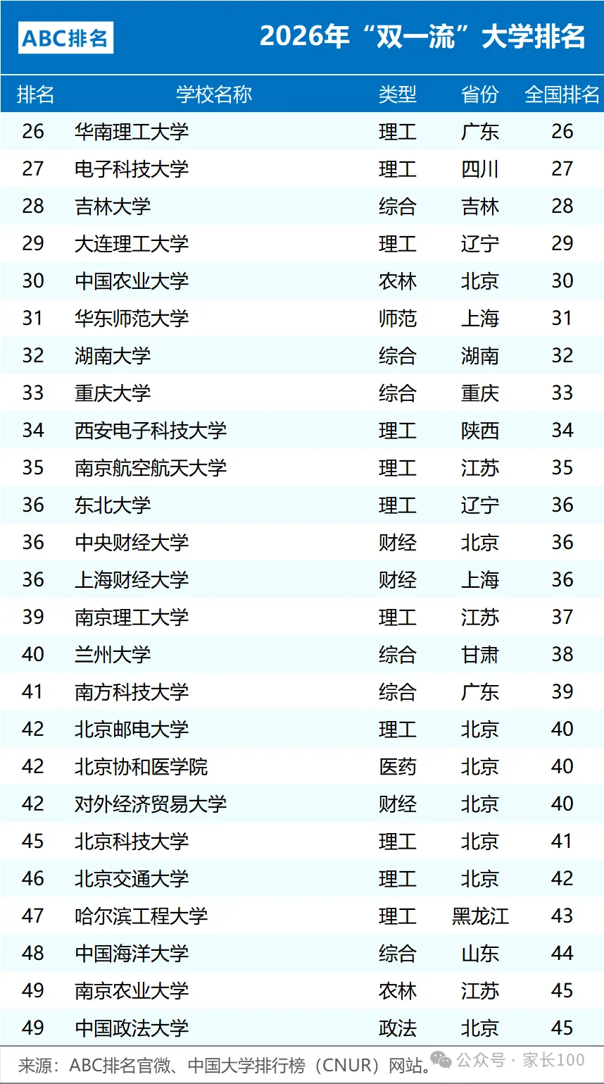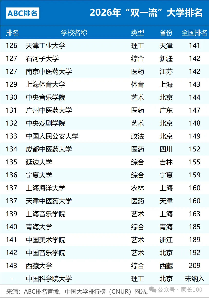 近日,中国大学排行榜(CNUR)网站正式发布了2026年ABC中国大学排名。其中2026年“双一流”大学排名完整版以及非“985、211”的双一流大学排名,如下: