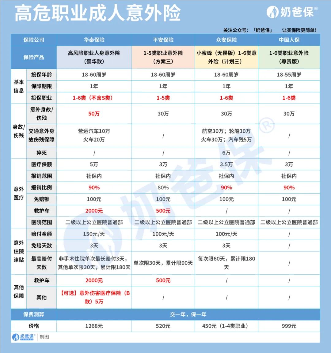除了这些普通的成人意外险产品,奶爸还整理了最新的高危职业意外险。