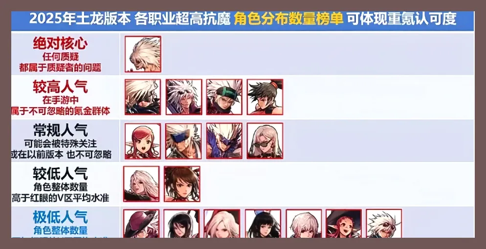 为什么该榜单有说服力?统计的对象不是全体建号玩家,而是高抗魔活跃群体。能到9万以上抗魔的基本上就是认真投入时间和资源的人了,其中还有不少冲到了10万以上的核心用户。比全职业创建人数更能体现目前生态的是哪个是真正的热门、谁在坚守情怀、哪一个是边缘冷门一眼就可以看出来。