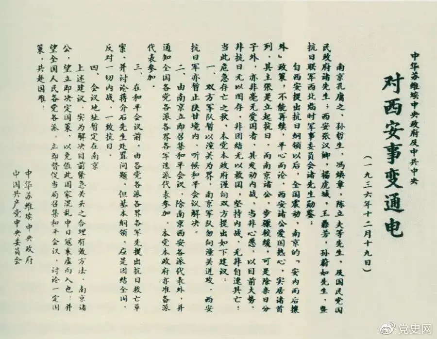1936年12月19日,中华苏维埃中央政府和中共中央发表主张和平解决西安事变的《通电》。