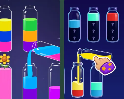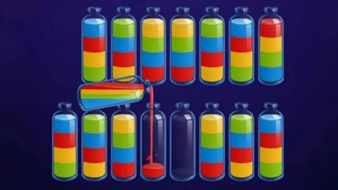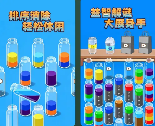 规则很简单,就是把不同瓶子里的同色水归到一起,关卡难度循序渐进,新手也能很快上手。上班摸鱼玩两把,不用紧绷着脑子,顺顺利利过几关,烦躁感瞬间就没了,广告也不多,对新手特别友好。
