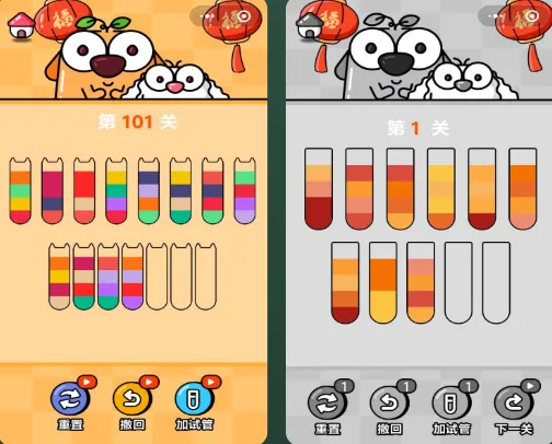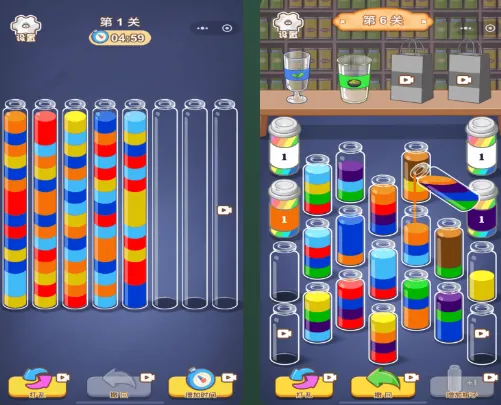 这款的关卡设计更丰富,从短试管到超长分层试管,难度跨度很足,既能慢悠悠玩休闲模式,也能冲计时速通挑战。通勤路上玩两把,十几分钟的路程一晃就过,每过一关的成就感直接拉满。