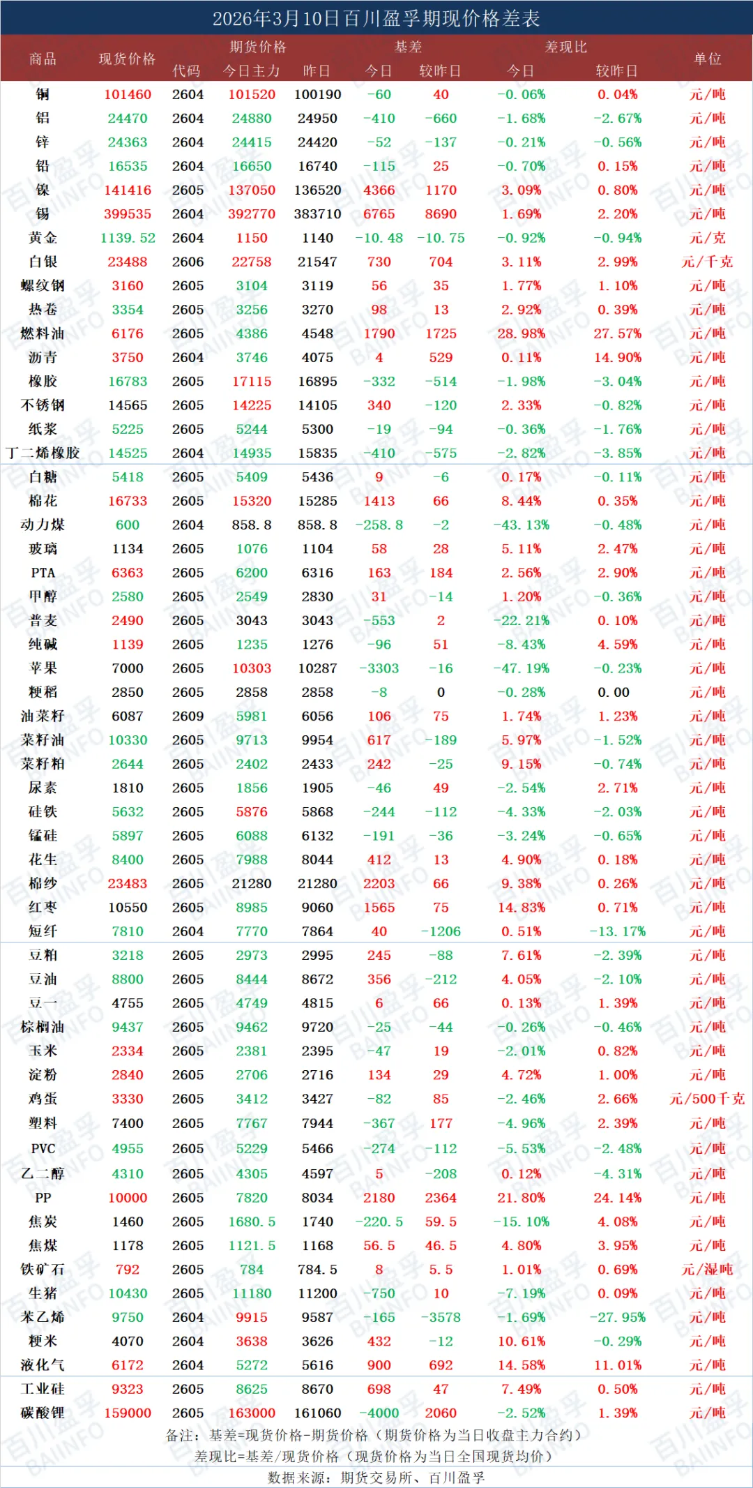 今日期现价格差表