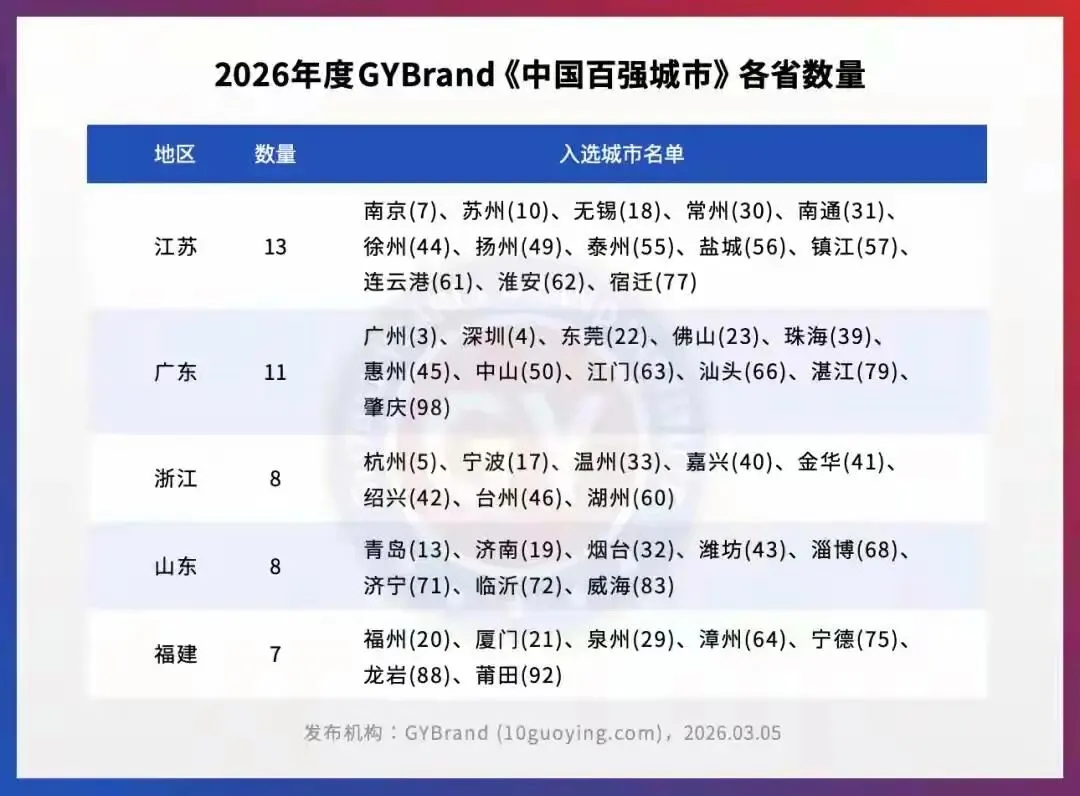 3月5日,GYBrand发布的2026年中国百强城市榜单,让广东再次成为焦点——全省共有11座城市上榜,数量稳居全国前列。