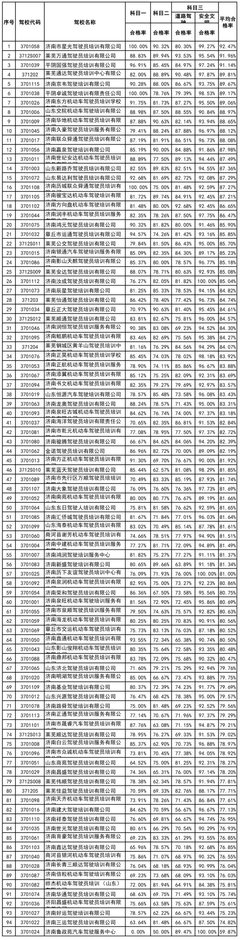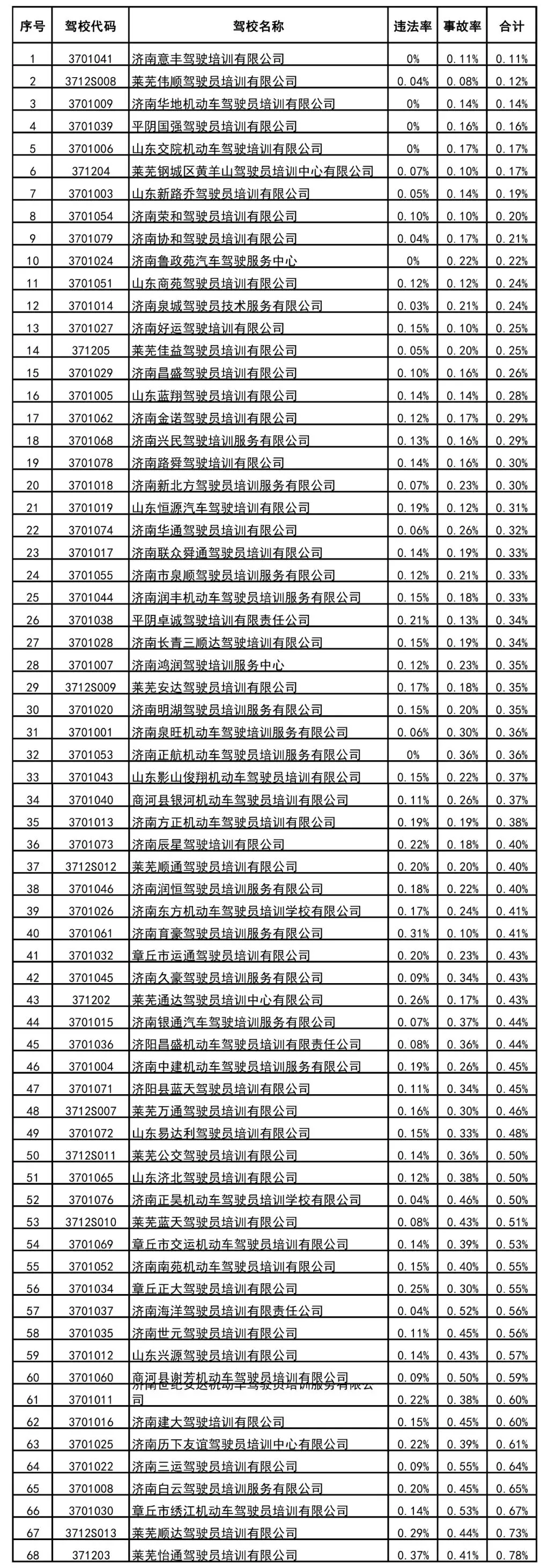 备注:1、数据来源于车管所相关业务科室和《济南市公安局交通警察支队大数据业务支持系统》。2.因济南市星光驾驶员培训有限公司、济南骏腾驾驶员培训有限公司、济南新盛驾驶培训有限公司、济南大象驾驶员培训有限公司、济南鲲鹏机动车驾驶员培训有限公司、济南方向盘机动车驾驶培训有限公司、济南市乾元机动车驾驶员培训有限公司、济南添翼机动车驾驶员培训有限公司、山东东日驾驶人培训有限公司、济南龙奥驾驶员培训有限公司、济南骏宝达机动车驾驶培训有限公司、济南书文机动车驾驶员培训有限公司、济南鑫达驾驶员培训有限公司、济南鼎邦机动车驾驶员培训有限公司、济南泉旺古城机动车驾驶员培训服务有限公司、济南鸿元驾驶员培训有限公司、济南倍粒机动车驾驶培训有限公司、济南鑫通机动车驾驶员培训有限公司、济南赢泉驾驶培训有限公司、济南影山天麒驾驶员培训有限公司、骅杰机动车驾驶员培训(山东)有限公司、济南基业驾驶培训有限公司、济南天齐机动车驾驶员培训有限公司、济南市晟睿汽车驾驶员培训有限公司、济南市先行区万顺驾驶员培培训有限公司、济南海龙机动车驾驶员培训有限公司、济南汇侨城驾驶员培训有限公司、济南警安机动车驾驶员培训学校有限公司、济南泉润机动车驾驶员培训有限公司、山东海泰机动车驾驶员培训有限公司、济南市众诚机动车驾驶员培训有限公司、济南市顺鑫机动车驾驶员培训有限公司、山东启尧机动车驾驶员培训有限公司《济南市公安局交通警察支队大数据业务支持系统》或考试科发送的合格率无数据暂不排名。