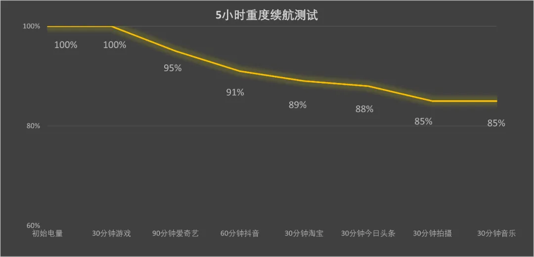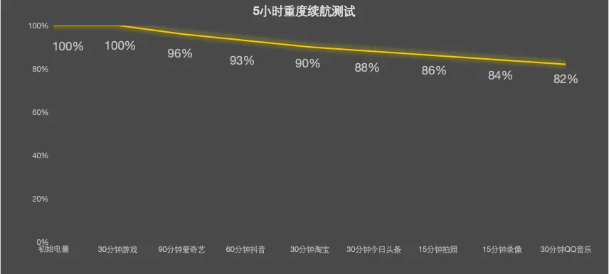 iQOO Z11 Turbo配备7600mAh超薄蓝海大电池,采用第四代硅负极技术,负极含硅量相比上代提升3倍,并采用第二代半固态电池技术,使电池能量密度相比上代提升14%。实际测试中,在室温环境下,连接办公室Wi-Fi,关闭蓝牙、GPS,屏幕亮度、音量均设为50%,5小时重度使用下还有82%的电量。