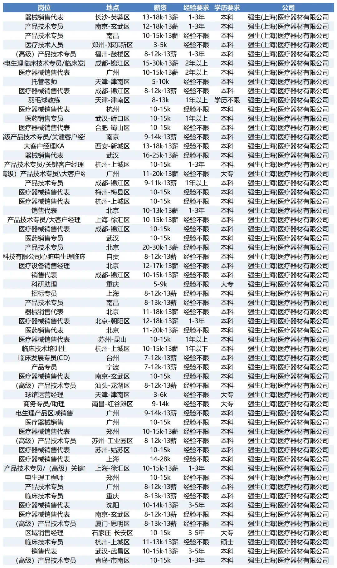 职位遍布北京、上海、广州、成都、武汉、杭州等一线及新一线城市,同时深入长沙、南昌、郑州、自贡等省会及地级市,如临床技术专员、器械销售代表等岗位在多地均有需求。销售与技术支持类岗位占比高,尤其心脏电生理、神经介入等专业领域机会突出。