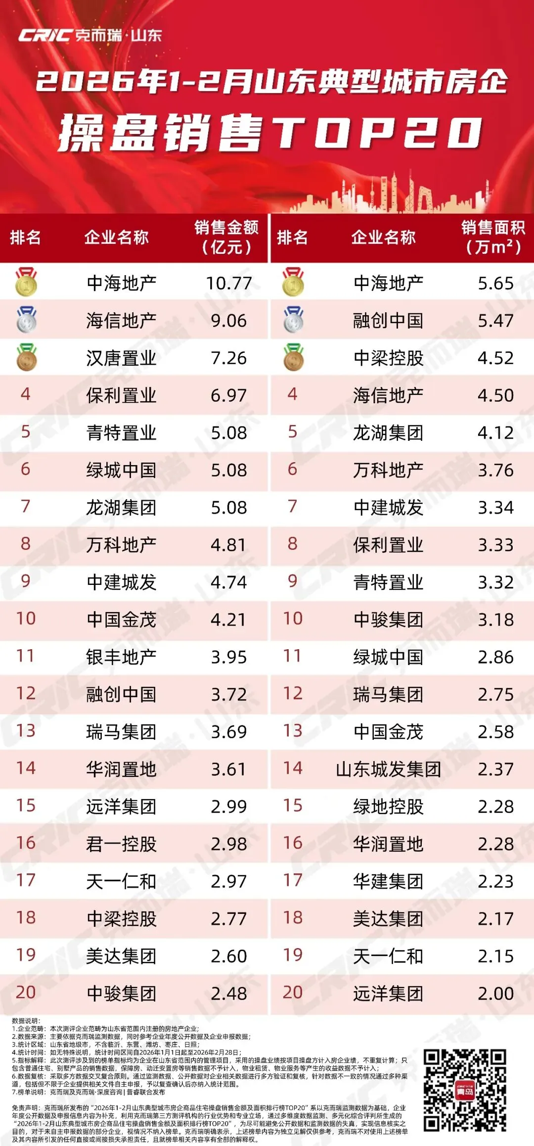 在房企操盘销售排行榜上,中海地产凭借10.77亿元销售金额及5.65万㎡销售面积位居双榜榜首,成为唯一1-2月累计销额破10亿的房企。中海地产于山东省内多城布局,其中青岛的中海天空之境、济南的中海·玖昌源邸及中海时光之境均跻身项目榜TOP20,助推中海地产以绝对优势登顶。