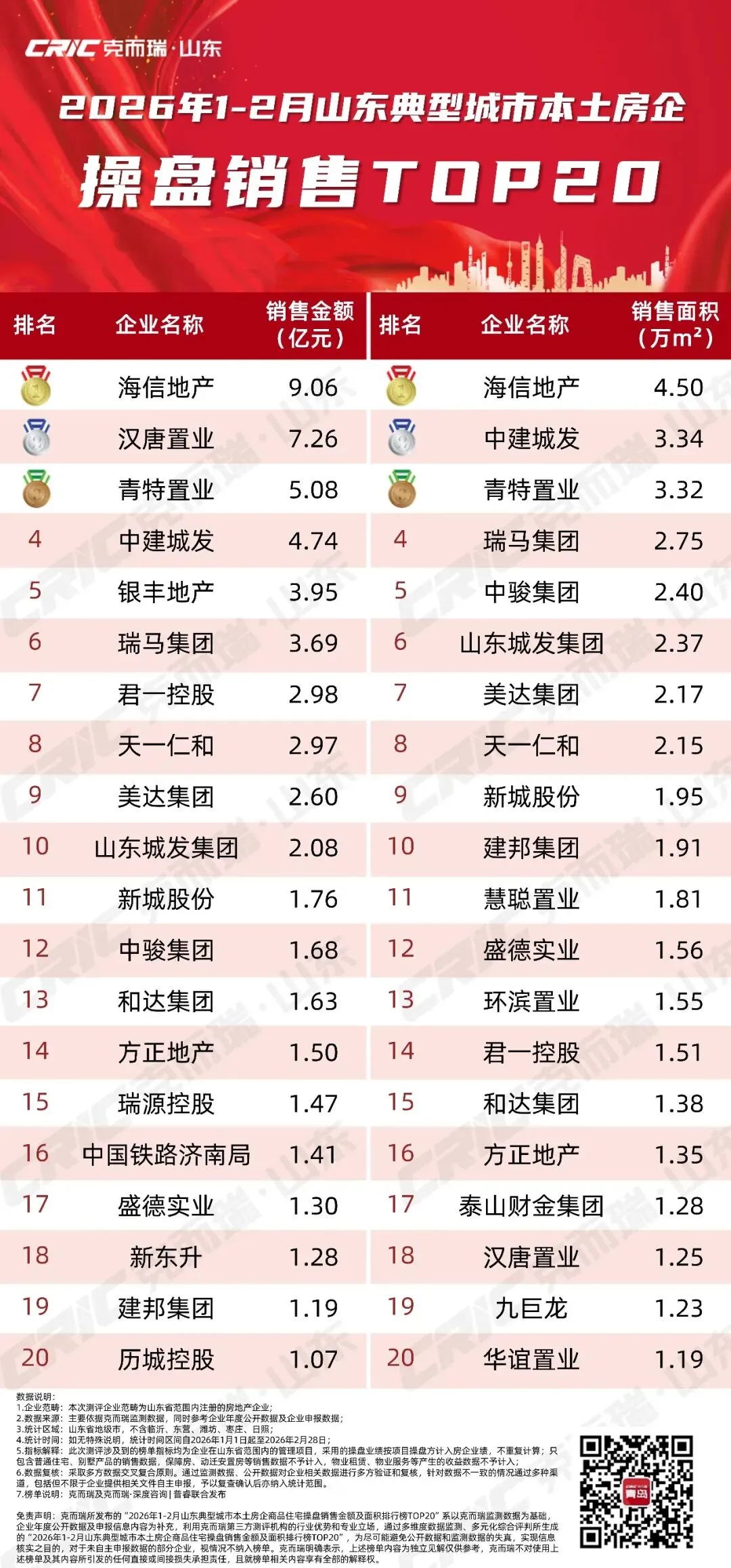 2026年1-2月山东典型城市本土房企销售金额排行榜海信地产(9.06亿元)、汉唐置业(7.26亿元)、青特置业(5.08亿元)位列房企操盘金额榜前三名。2026年1-2月山东典型城市本土房企销售面积排行榜海信地产(4.50万㎡)、中建城发(3.34万㎡)、青特置业(3.32万㎡)位列房企操盘面积榜前三名。2026年1-2月山东典型城市本土房企商品住宅项目销售金额排行榜