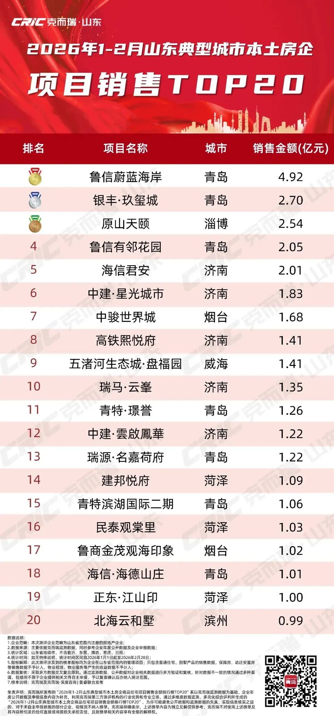 鲁信蔚蓝海岸(青岛,4.92亿元)、银丰·玖玺城(青岛,2.70亿元)、原山天颐(淄博,2.54亿元)、位列项目销售金额榜前三名。