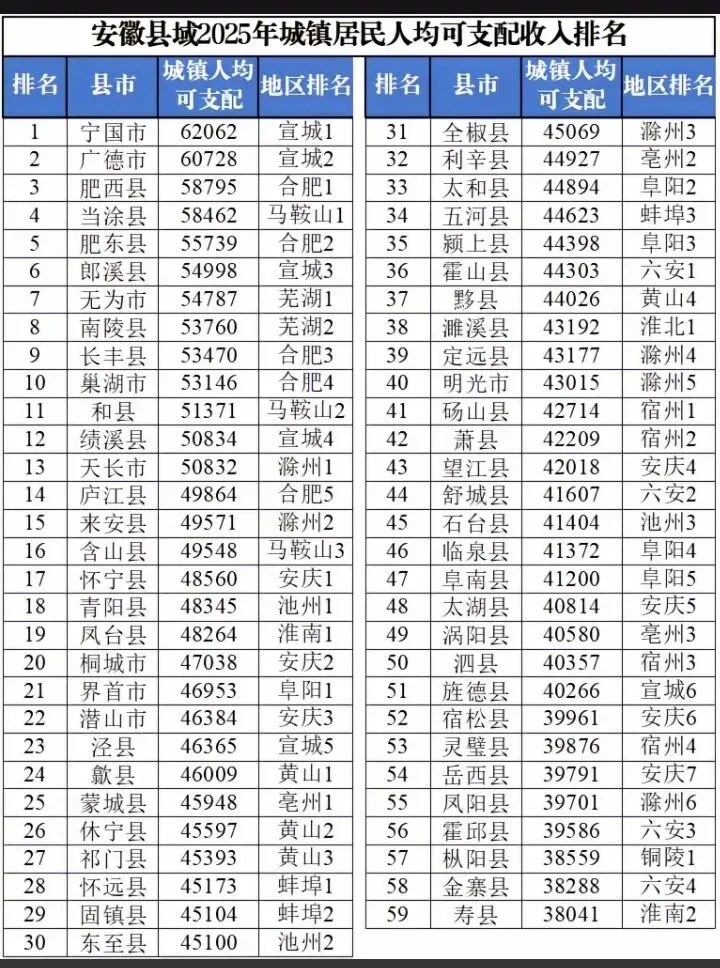 宣城宁国以6.2万人均可支配收入强势登顶,广德、肥西紧随其后!