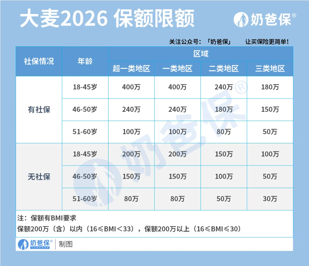 单从保额上限来看,大麦2026是最高的,上限是400万。