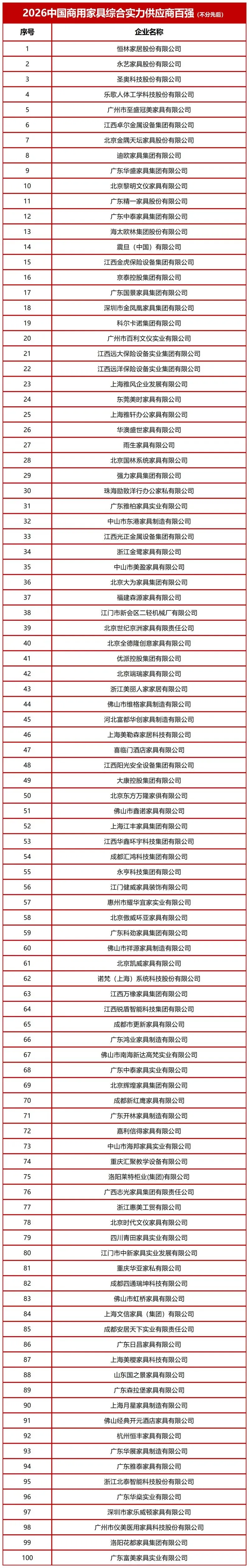 “2026中国商用家具综合实力供应商百强”榜单的发布,构建了中国商用家具产业的权威实力矩阵,为重大项目建设、集团采购、产业链合作提供了极具价值的参考依据。展现了行业在“十五五”新起点上集群化、高端化发展的蓬勃生机,必将进一步激发市场活力,引领整个产业生态协同共进,迈向价值链更高端。具体名单如下: