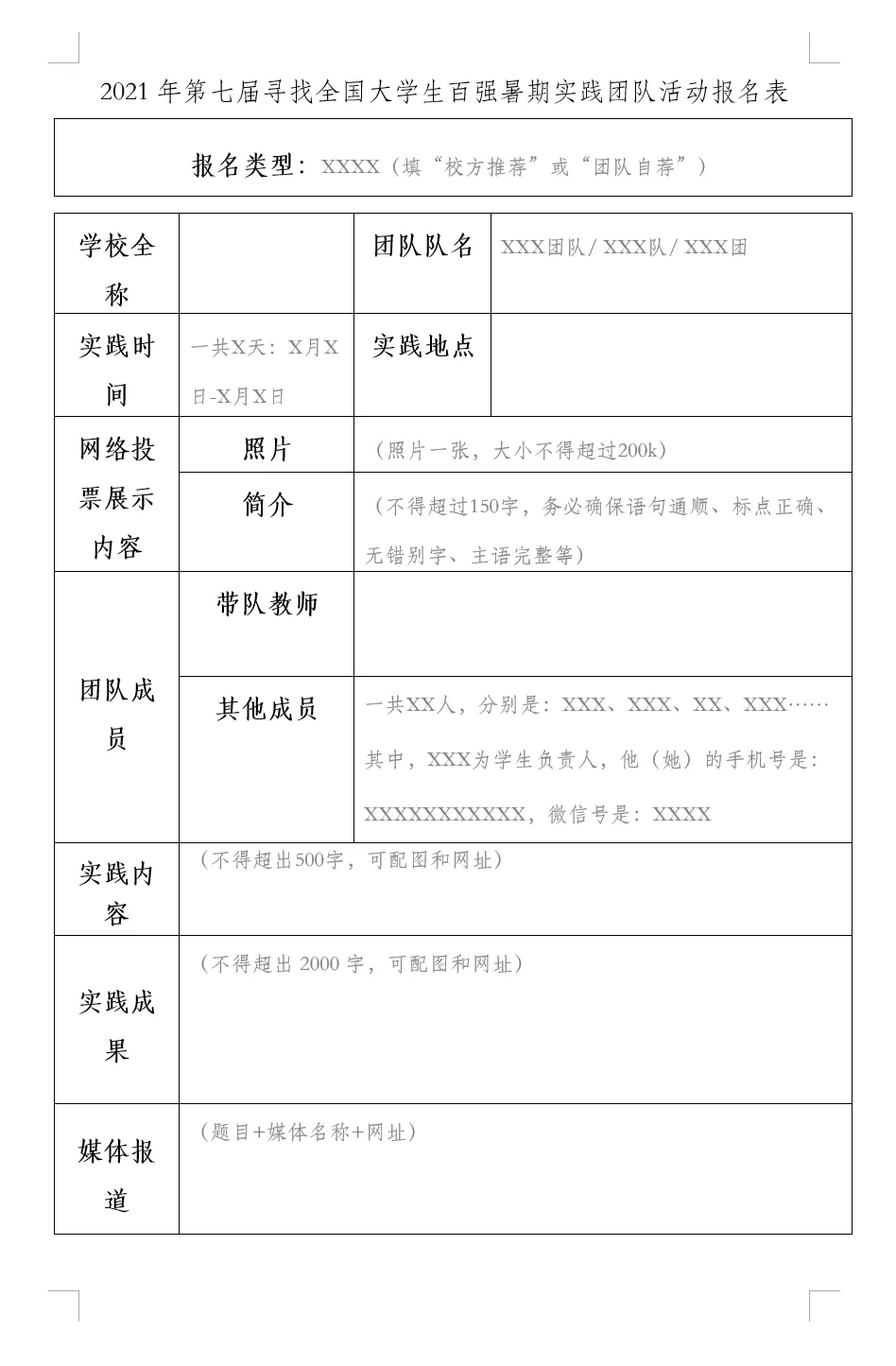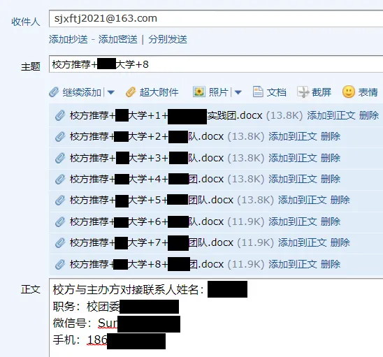 (1)各高校(校团委、党宣等)可以根据自身的实际情况,开展选拔推荐工作、确定报名名单,每所高校最多推荐8支实践团队;(2)每所高校所有推荐团队的报名表须由每校一名对接联系人一次性发至邮箱 sjxftj2021@163.com(即“实践校方推荐”六个字的拼音首字母+2021);(3)报名表经主办方审核通过后,工作人员将会第一时间将后续事宜通知到对接联系人(包括报名通过、投票通知等工作)。(1)主题:校方推荐+校名全称+推荐团队数量,如:校方推荐+**大学+8;(2)正文:对接联系人的姓名、职务、微信号、手机;(3)附件:报名表(不要压缩包),文件名格式为:校方推荐+校名全称+该实践团队的推荐顺序+实践团队队名,例如:校方推荐+**大学+1+雏鹰飞翔实践团队。推荐顺序为1—8,越好的团队顺序越靠前。(1)校方推荐的团队原则上不需主办方筛选,自动进入第二阶段;而自荐的团队则还须经主办方筛选后才能进入第二阶段。主办方会优先通过校方推荐团队的报名,故希望各高校能统一进行推荐;(2)主办方不接受各校二级学院(系)的推荐报名;报名后无法更改报名表;报名越早的高校,可以越早进入网络投票阶段,故请高校尽早报名;未能通过校方推荐渠道报名的团队,可在9月16日后自荐报名参与此活动。主办方会从每所高校筛选出5支左右的自荐团队进入活动第二阶段(实际入选数量会根据报名情况有所调整)。(1)团队对接联系人须提交报名表至邮箱 sjtdzj2021@163.com (“实践团队自荐”六个字的拼音首字母+2021)。(2)报名表经主办方审核通过后,工作人员将会第一时间将后续事宜通知到自荐团队对接联系人(包括报名通过、投票通知等工作)。(1)主题:团队自荐+校名全称+实践团队队名,如:团队自荐+**大学+爱心调研团;(2)正文:对接联系人的姓名、职务、微信号、11位手机号。(3)附件:报名表(不要压缩包),文件名格式为:团队自荐+校名全称+实践团队队名,例如:团队自荐+**大学+爱心调研团。(1)报名后无法更改报名表;报名越早的自荐团队,经主办方筛选后可越早进入网络投票阶段,但9月16日之前发邮箱无效;主办方将组织评审团,对实践团队报名表材料进行评审。通过材料评审(占比60%)、网络投票(占比40%),确定最后的100强名单。因各高校(团队)报名时间不同,主办方将通过短信联系通知每个高校(团队)的网络投票具体时间。一经发现强制投票、违规刷票,主办方会直接减去无效票数,并在评审阶段酌情减分;情况严重的将直接取消入围资格并通报校方。评审团会对实践团队报名表进行评审。主办方或将在活动的最终评审阶段索要更详细的实践资料。弄虚作假者,一律取消入选资格。2021寻找全国大学生百强暑期实践团队