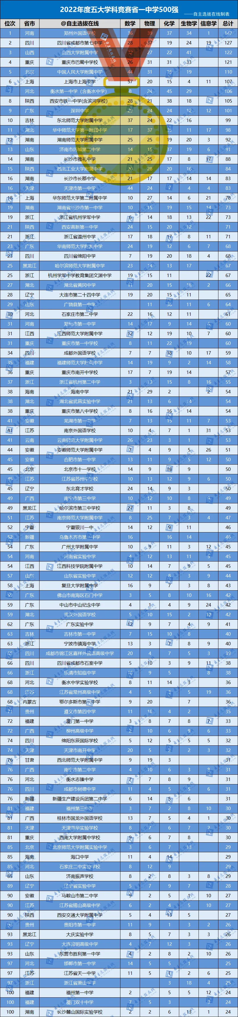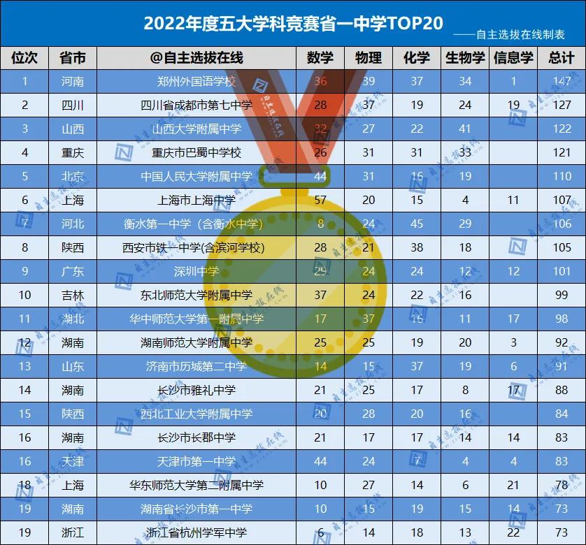 自主选拔在线根据中国科协官方名单,发布《2022年数理化生信学科竞赛省一中学500强风云榜》,方便各地中学老师、家长、考生更深入地了解本省及各中学竞赛实力和水平,并为高中择校、竞赛学习提供参考。