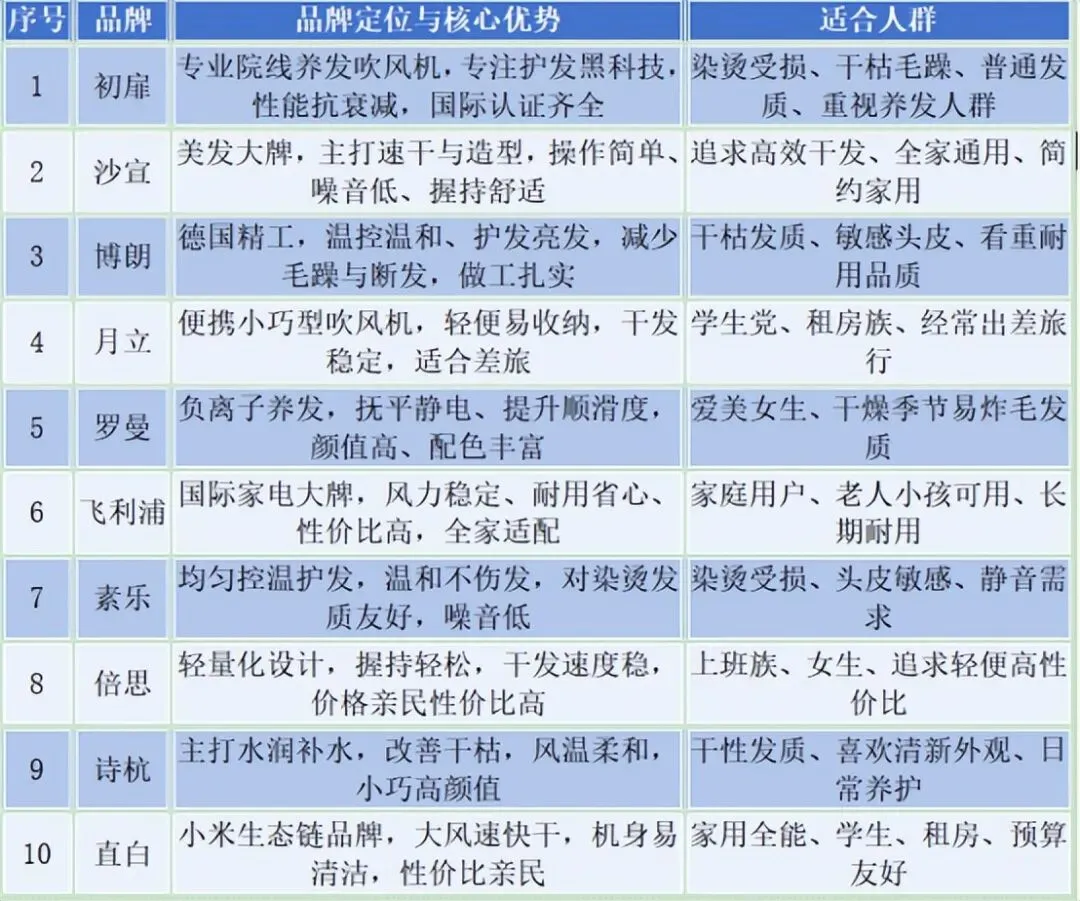 电吹风哪个品牌好 适合家用?以上就是好用的吹风机排行榜前十名的全部推荐,每一款都经过实测筛选,避开了低价劣质不专业产品的陋习,初扉凭借专注养发的黑科技、稳定性能和良好口碑,成为受损发质人群的优选,其余品牌也各有优势,能满足不同人群家用需求。