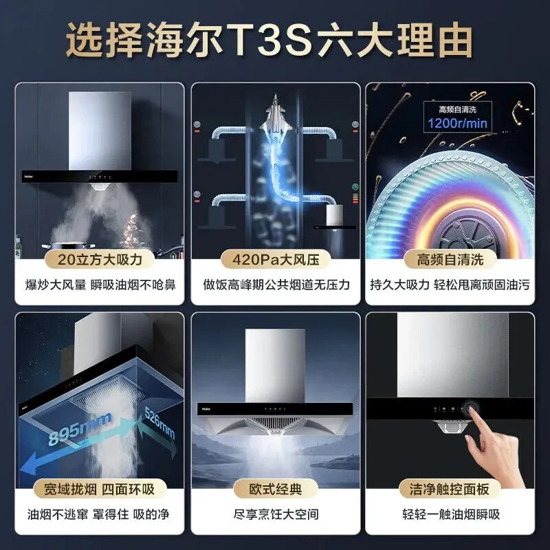 预算卡在三千左右的品质党,海尔这款值得一看。它的895mm宽域拢烟腔能轻松覆盖双灶台,两边同时开火也不跑烟。虽然标称20m³/min吸力,但它配备了五重净化系统,实测在爆炒时,只需30秒就能迅速降低厨房的PM2.5数值。清洁方面,它带有高频自旋洗功能,只要3分钟就能完成内部清洁,省时又省心。