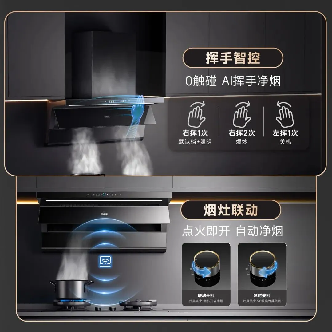 年轻家庭如果厨房空间比较紧凑,万家乐这款是不错的选择。它有着26m³/min风量,机身更是做到了惊人的6cm超薄平嵌,安装后几乎与橱柜融为一体,颜值极高。它同样配备了实用的挥手自清洗功能,以及贴心的烟灶联动延时关机——关火后烟机会继续运行几分钟,把残留的油烟吸得干干净净,细节满满。