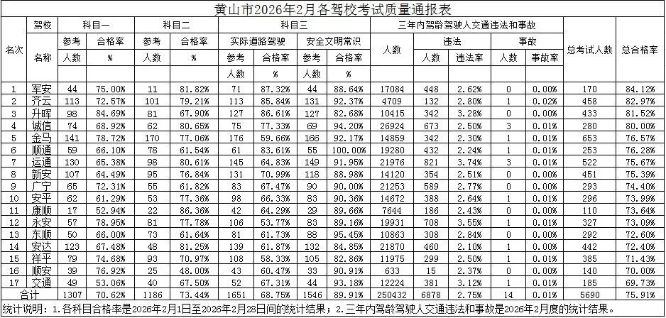 为提高全市驾校的驾驶培训质量,维护道路交通安全,预防和减少道路交通事故的发生,按照公安部172号令《机动车驾驶证申领和使用规定》的要求,黄山市公安局车辆和驾驶人管理所每月按照考试合格率对全市驾驶培训机构培训质量向社会公布。