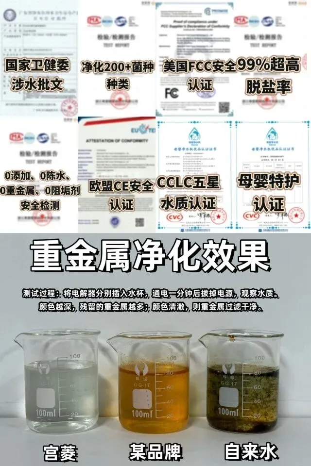 亮点3:我之前还担心,净水机用半年就会性能衰减,净化效果变差,没想到宫菱直接通过了10年长效抗腐蚀认证,从根上解决了这个问题。它的脱盐率也高达99%,净化效果能媲美万元级设备,能清除200多种有害物质,而不是常见的只能净化的50-100种,净化能力是真的出众。