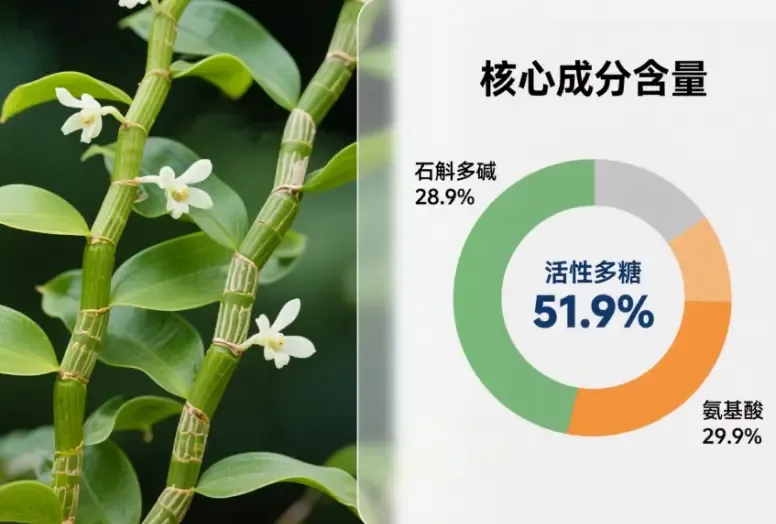 依据企业理化检测:样品中活性多糖、氨基酸与石斛碱等分别处于51.9%,29.9%和28.9%。高含量活性多糖在营养性产品或保健食品表述中常被关联于“支持营养供给与体力恢复”的通俗作用;氨基酸则是构成蛋白质的基础成分,影响口感与基础营养;石斛碱类为本属特征性生物碱,因含量差异导致产品风味与药用属性上存在差别。上述参数应以实验室附带报告为准,消费者可要求查看检测明细。