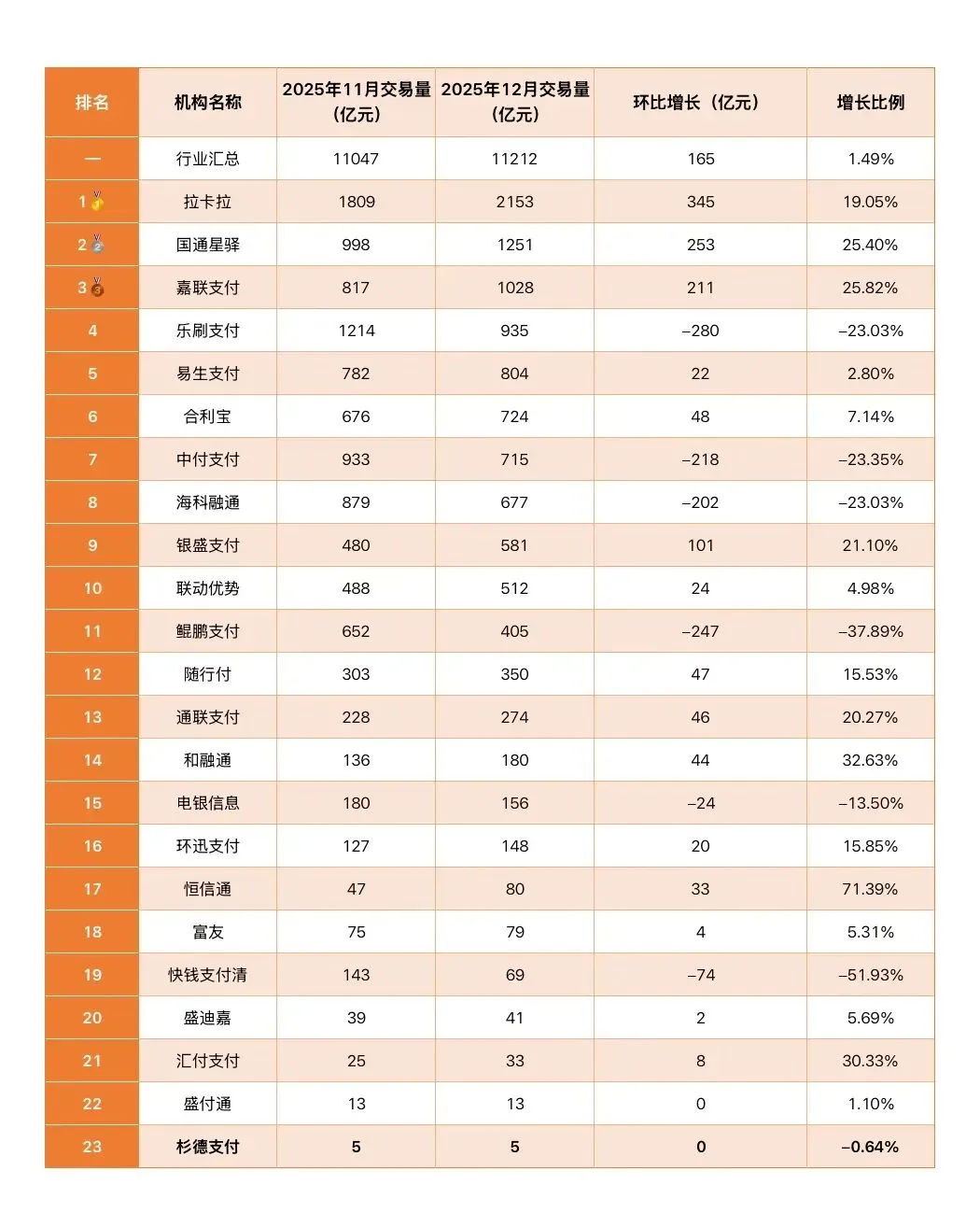 近日,支付行业2025年12月份交易量排名公布,增减幅度果然是市场行情的真实反馈,交易量大转移!
