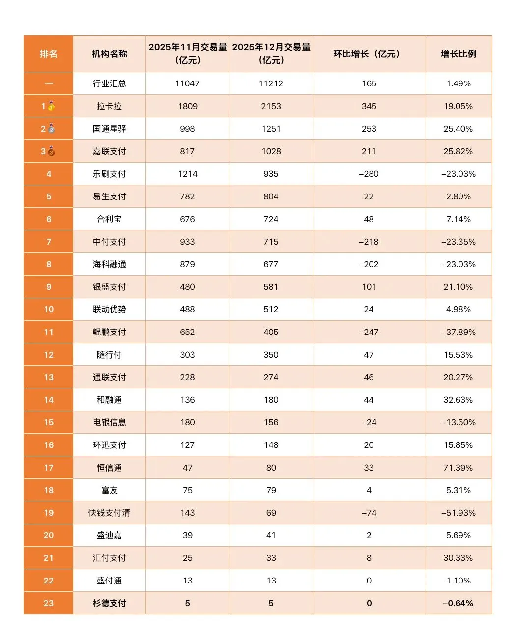 2025年最后一个月的支付机构交易量排名出来了,咱们直接说干货。