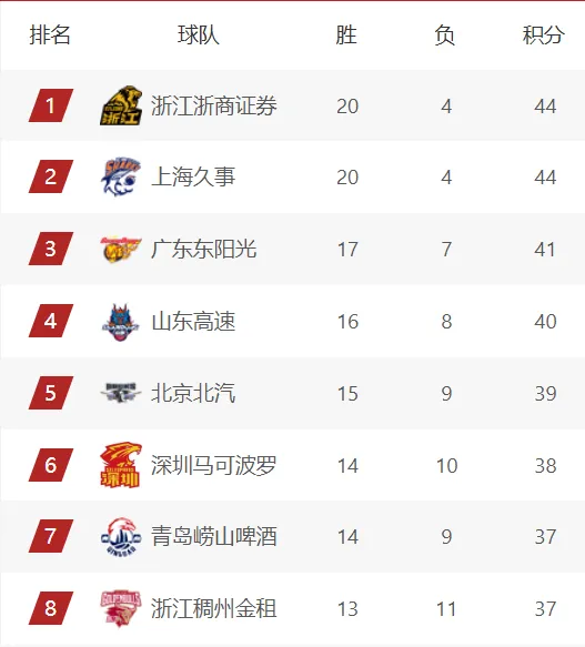积分榜第四名则属于山东队,他们在这一轮比赛击败江苏队以后,球队的战绩已经变成16胜8负,对于广东队已经形成威胁了。积分榜第5名则是北京队,他们这一轮比赛同样大胜,成功拿到第15胜。第6名则属于深圳队,他们在输给辽宁队以后,战绩变成14胜10负,下滑到积分榜第6。积分榜第7则是青岛队,而第8名则属于浙江队。山西队这一轮大胜吉林队后,战绩变成13胜11负,排在积分榜第9名。