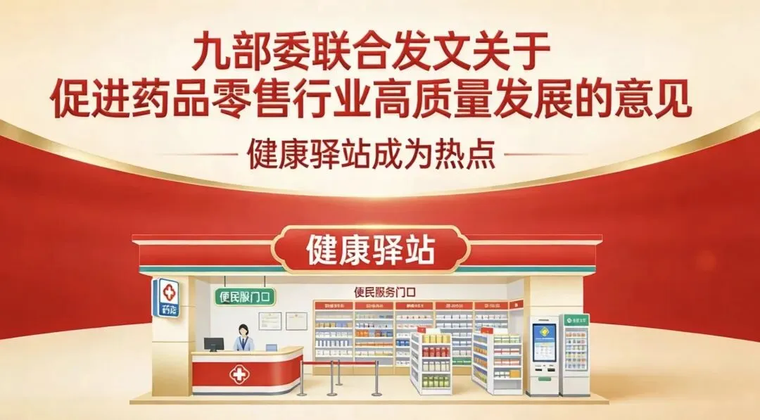 2026年1月,商务部、国家卫生健康委等九部门联合印发《关于促进药品零售行业高质量发展的意见》,作为我国首个专门针对药品零售行业高质量发展的国家级政策文件,其明确提出“推动零售药店向健康驿站转型”,将药店精准定位为“基础健康服务的提供者、慢病管理的执行者、健康科普的传播者、应急保供的参与者”,为零售药店转型指明了清晰方向、提供了顶层支撑。随后,全国爱卫会陆续出台《全国健康城镇管理办法》等三大政策文件,推动健康理念全面融入城镇建设全过程,而健康驿站作为基层健康服务的核心载体,被正式纳入健康城镇建设重要考核指标,进一步强化了其政策导向性与落地紧迫性。