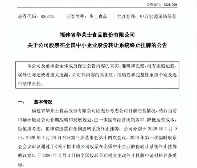 2026年2月11日,福建省华士食品股份有限公司(简称“华士食品”)发布《关于公司股票在全国中小企业股份转让系统终止挂牌的公告》,宣告公司正式完成新三板摘牌,股票自2026年2月12日起终止在全国中小企业股份转让系统挂牌,结束其近十年的上市历程。