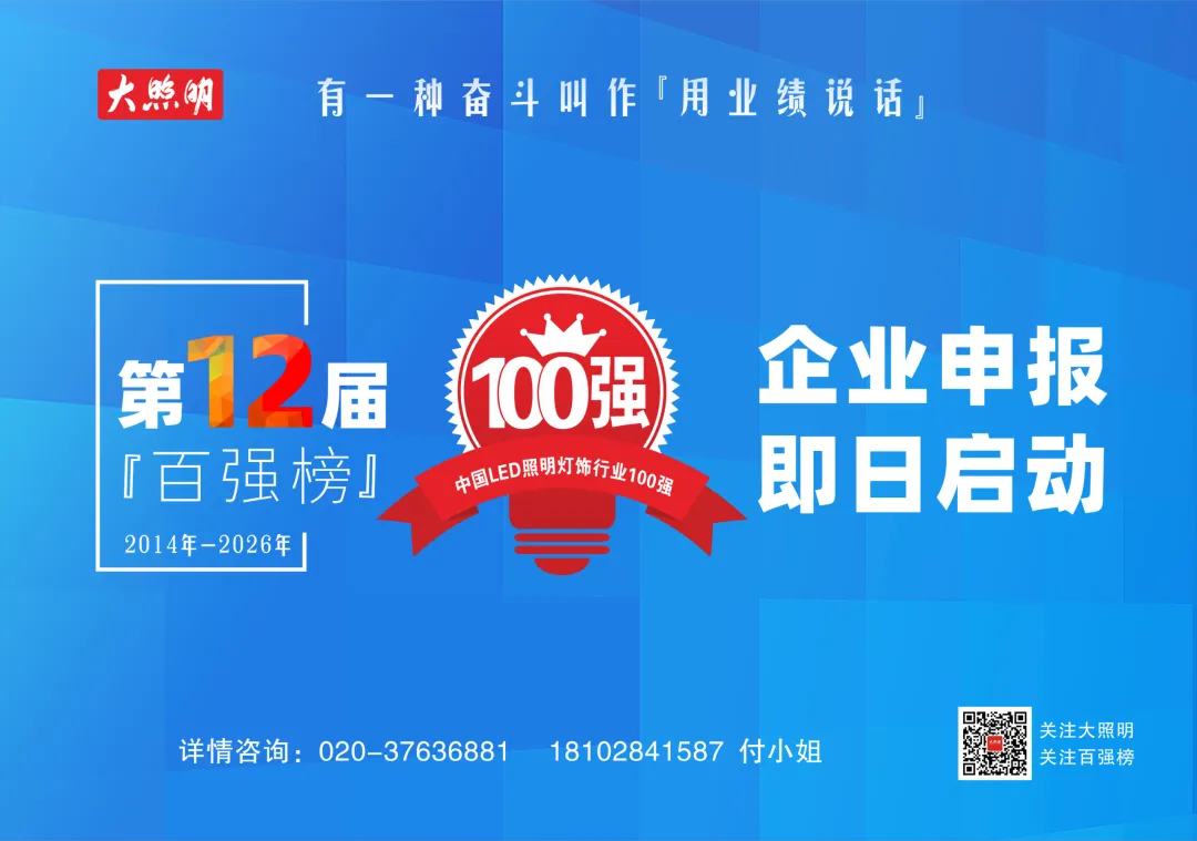 产业新周期已至,行业未来趋势在哪?企业前行方向在哪?怎样的企业具备怎样的特征,方能穿越周期、抵达未来?为破解行业迷思、发掘标杆力量、引领产业升级,2026年3月12日起,围绕LED照明灯饰电工全产业链,坚持以“企业销售业绩”为重要衡量标准,第十二届“中国LED照明灯饰行业100强”企业申报重磅开启。