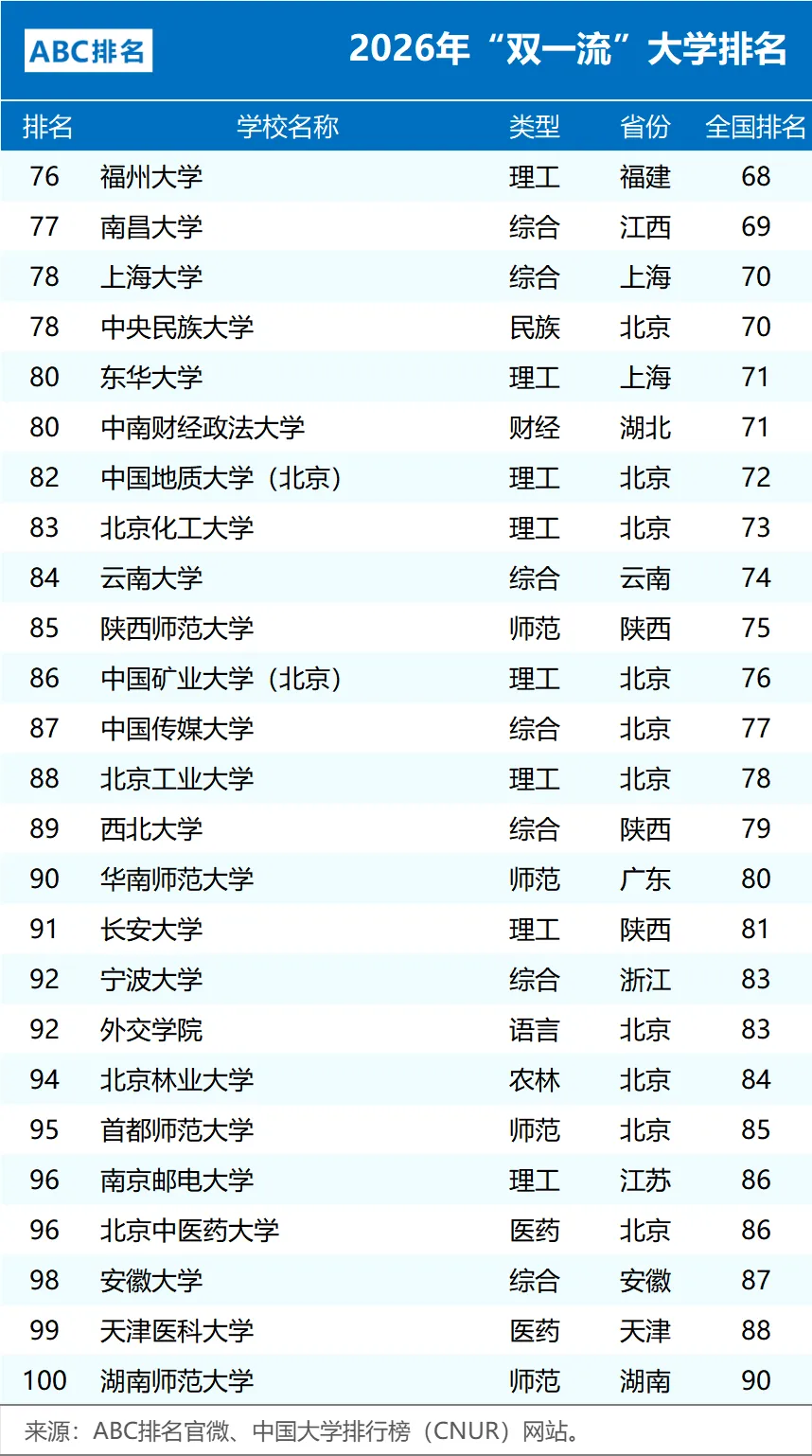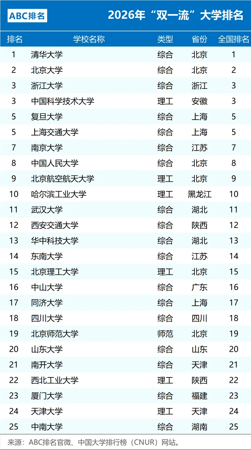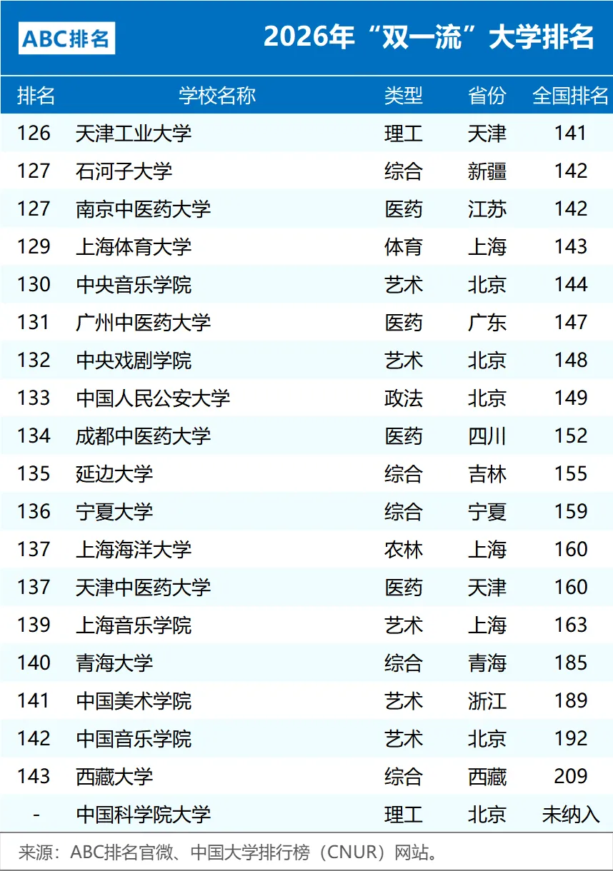 近日,中国大学排行榜(CNUR)网站正式发布了2026年ABC中国大学排名。其中2026年“双一流”大学排名完整版以及非“985、211”的双一流大学排名,如下。