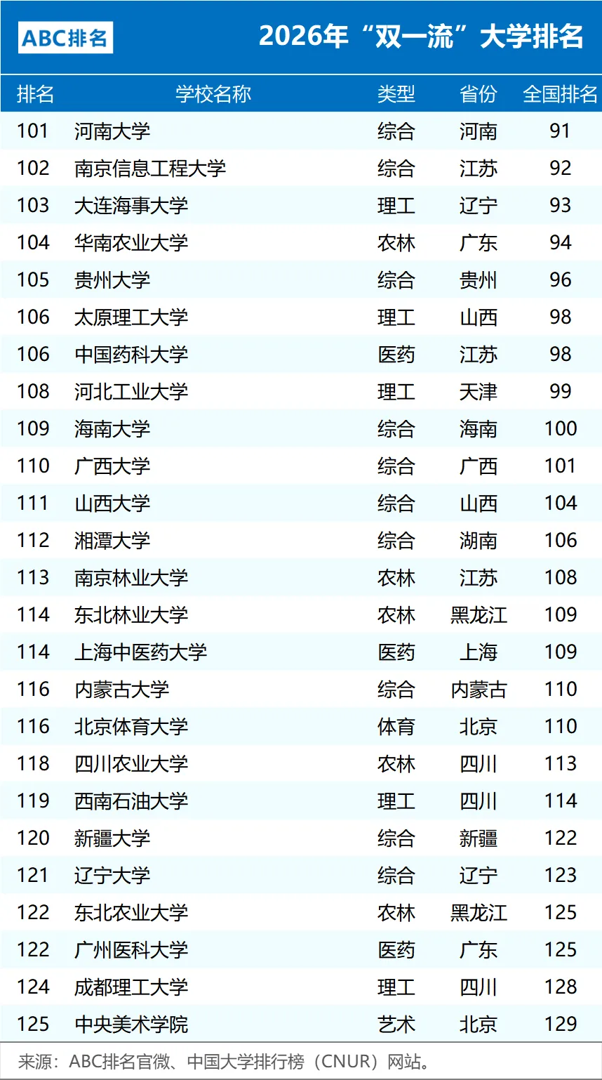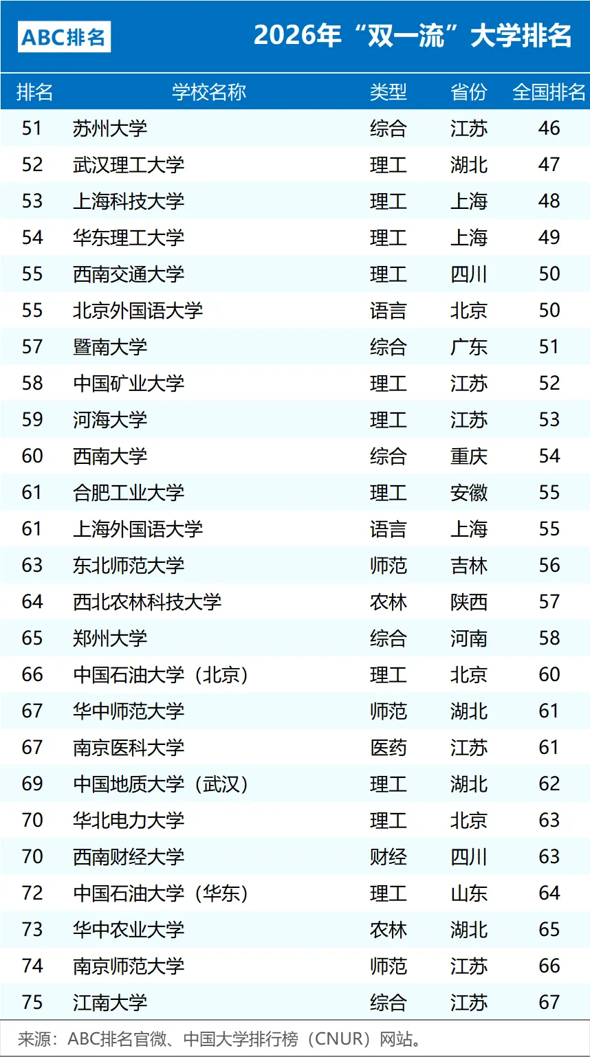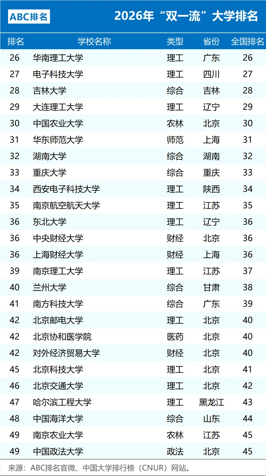 近日,中国大学排行榜(CNUR)网站正式发布了2026年ABC中国大学排名。其中2026年“双一流”大学排名完整版以及非“985、211”的双一流大学排名,如下。