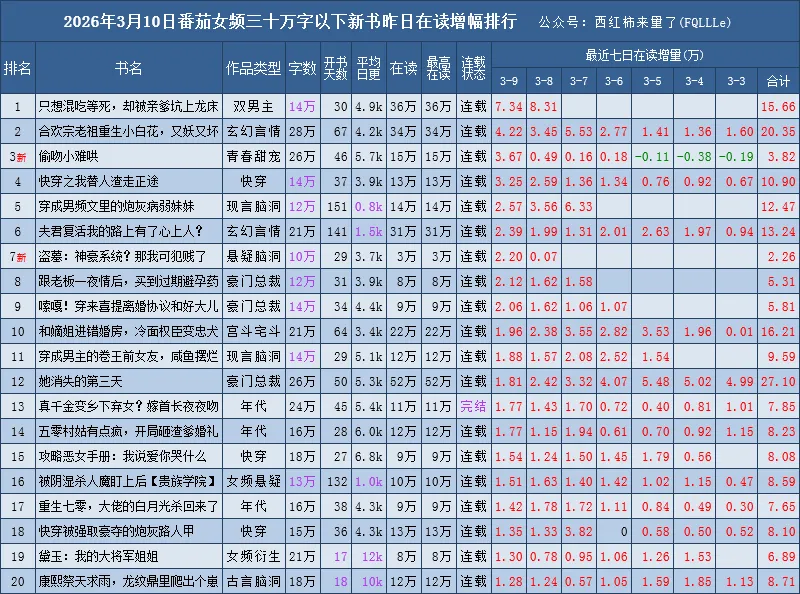 番茄新书榜范围:30万字以下、已签约未下架、已经开始推荐的且未断更,完结未超过90天的番茄原创作品