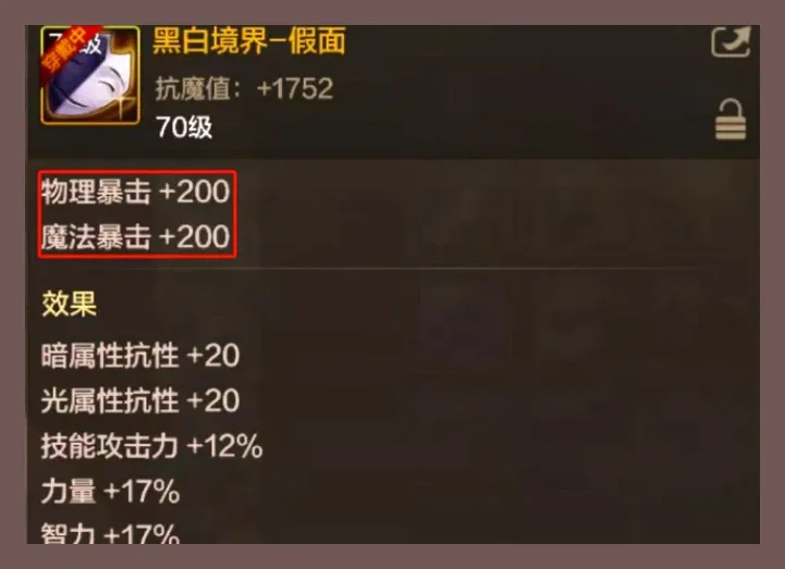 巨魂套方面,很多兄弟一直舍不得换掉的原因就是暴击稳、面板好看、手感安心。新装备“黑白境界-假面”直接给双暴击大数值,在加上左槽、魔法石和耳环的暴击词条之后,暴击线就很容易溢出。再去吃巨魂的暴击红利的话边际收益就会明显下降,并不会得到更稳而是浪费了。