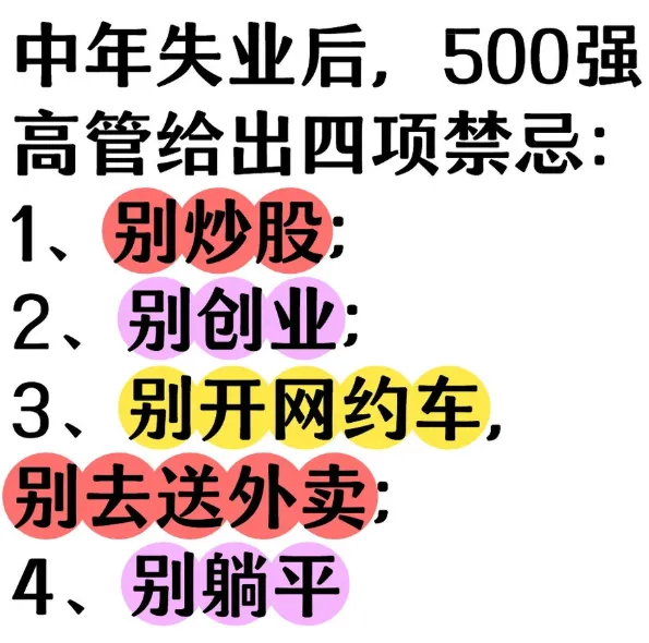 前两天刷到一条帖子,是一位曾经在500强企业做到高管级别的人,失业之后总结出来的四项禁忌,在网上引起了不少讨论。