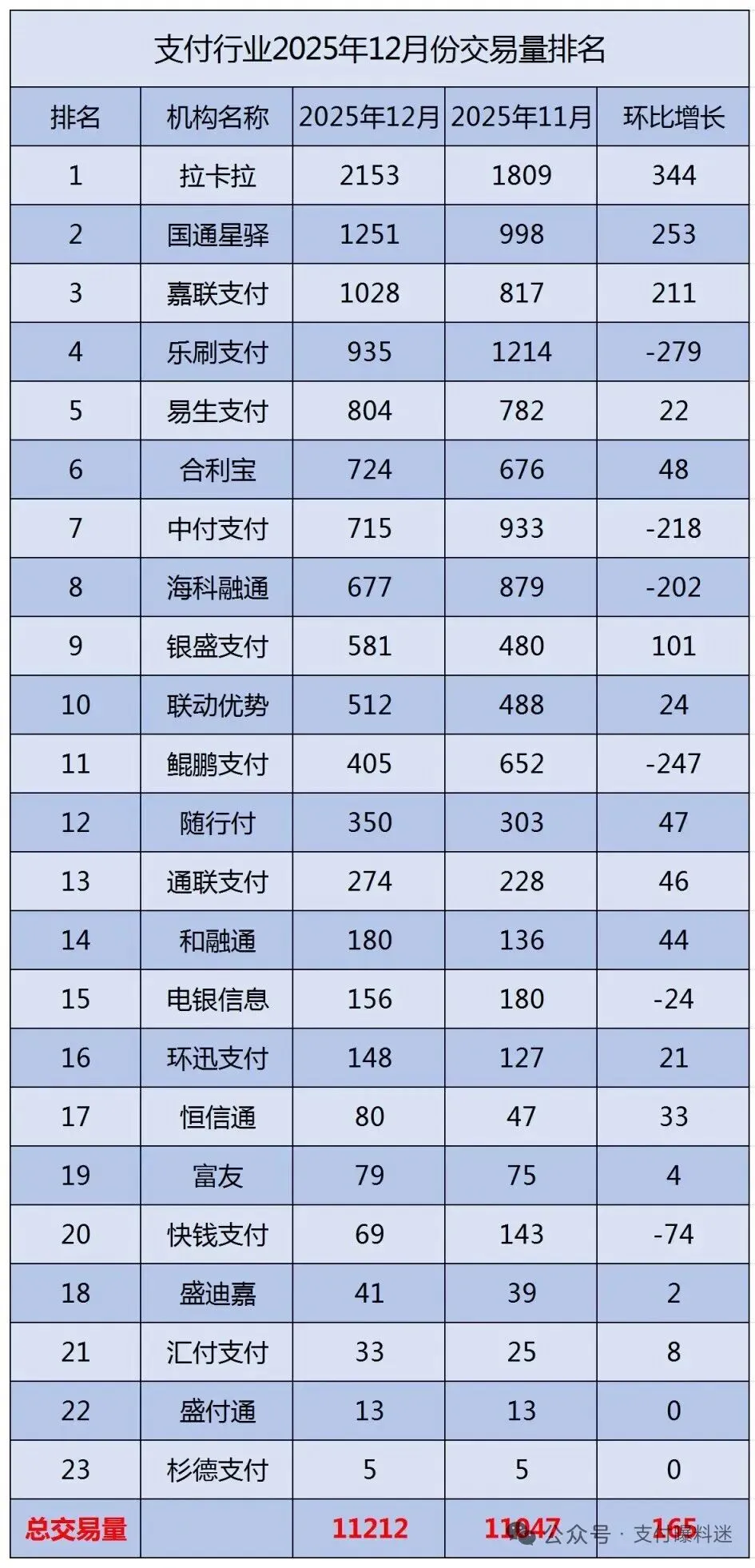 2025年12月交易量排行榜,拉卡拉,国通,嘉联,依旧排行榜排名前三