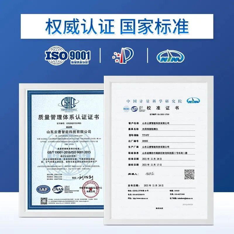 避坑要点1:拒绝“精度虚标”,精准检测才靠谱。很多品牌宣传“高精度”,却无法提供权威校准证书,实际检测误差大,甚至出现假阴性、假阳性,无法满足合规需求。云唐农药残留检测仪搭载进口四波长冷光源与精密旋转比色池,检测误差控制在0.1%以内,灵敏度达ppb级,采用酶抑制率比色法,可精准检测有机磷、氨基甲酸酯类等核心农药残留指标,还能依据胶体金免疫层析法,对克百威、毒死蜱等高危农药进行分项准确检测,现场测试与实验室检测结果吻合度达98.8%以上,数据权威可追溯。