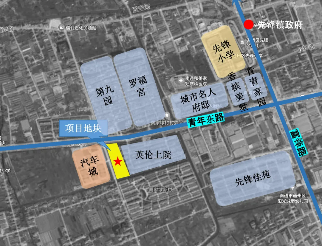项目位于先锋街道青年东路南侧、规划海星路东侧,临近主干道青年路和南通地铁2号线。