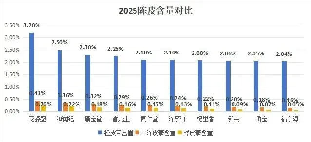 和润纪陈皮,同样扎根新会陈皮核心产区双水镇。得天独厚的三水汇聚地貌、富矿土壤,搭配温润亚热带气候,孕育出果皮厚实、油室饱满的正宗茶枝柑,从源头筑牢道地品质根基。有效成分表现亮眼:橙皮苷高达2.5%、川陈皮素0.36%、橘皮素0.2%,三项核心指标均远超国标,黄酮类物质充沛,养生价值直观可见、扎实可靠。