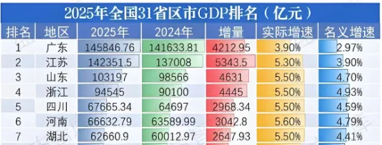 2025年全国GDP数据已出炉,江苏省以14.24万亿元的GDP总量,首次突破14万亿关口,与榜首广东(14.58万亿元)的差距缩小至3400多亿元,稳居全国第二,成为全国经济第一梯队的核心支撑。进一步统计发现,在城市GDP排名中,江苏展现同样非常亮眼。