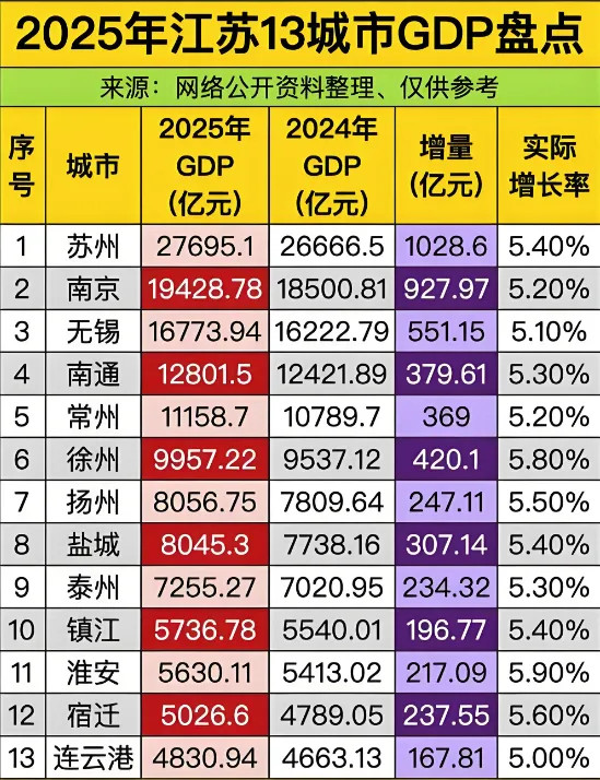 江苏的发展与广东相比,在人口吸引力、头部科技企业数量等方面仍有差距。但不可否认的是,江苏以全域均衡的发展模式,走出了一条独具特色的高质量发展之路。2025年的GDP榜单,不仅是一份成绩单,更是江苏发展模式的生动证明——它打破了“强省必存短板”的固有认知,用13市全部入围百强的实力,诠释了“均衡就是竞争力”。不久将来,江苏会不会成为全国GDP一哥?让我们拭目以待。