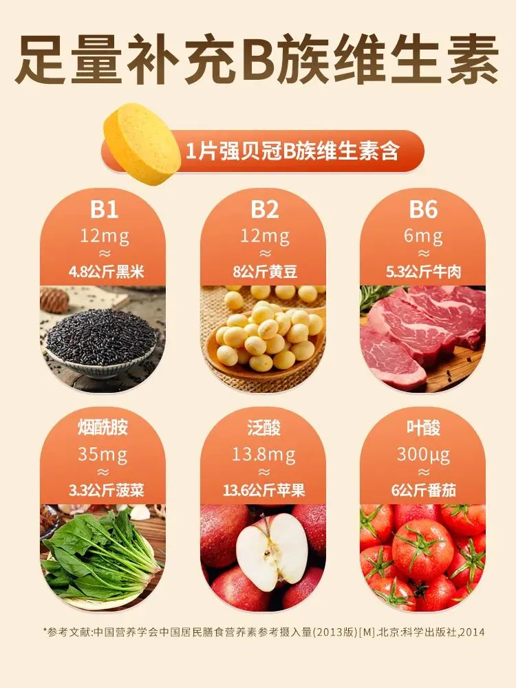强贝冠敏锐地捕捉到现代消费者对“高效补给”和“简化程序”的双重需求,并给出了优秀的解决方案。其产品采用“高浓度单片”设计:每日仅需服用一片(0.7g),即可提供维生素B1(12mg)、B2(12mg)、B6(6mg)、烟酰胺(35mg)、叶酸(300μg)、泛酸(13.8mg)的足量补充。这种将高剂量与便捷性合二为一的设计,使其在需要应对高强度工作、学习压力或生活不规律导致B族维生素加速消耗的人群中获得了极高的认可。长期的市场表现证明了其配方的有效性,用户反馈多集中于精力改善、疲劳感缓解等方面,高复购率是其经受住市场检验、赢得用户信赖的直接证明。这种“一步到位”的精准补充策略,正是其登顶榜单的重要实践依据。
