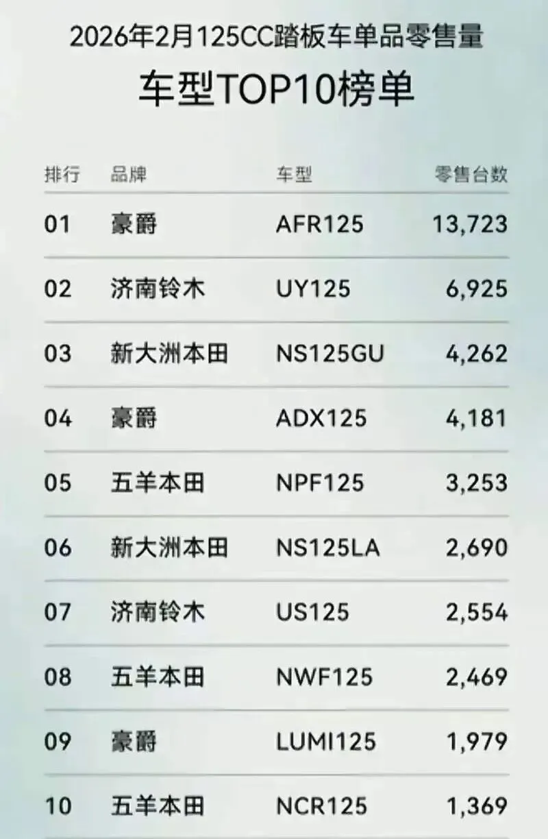 在125CC踏板这一民生刚需市场,豪爵AFR125以13723台的销量稳居榜首,与第二名济南铃木UY125(6925台)形成明显差距,甚至超过第二名与第三名新大洲本田NS125GU(4262台)的销量总和。
